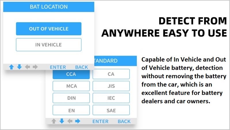 Capable of on-board and off-board battery detection without removing the battery from the car, which is an excellent feature for the battery dealers and private car owners.