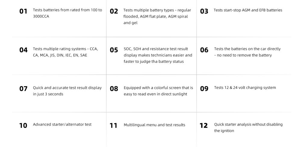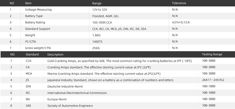 - Test multiple rating systems – CCA, CA, MCA, JIS, DIN, IEC, EN, SAE.