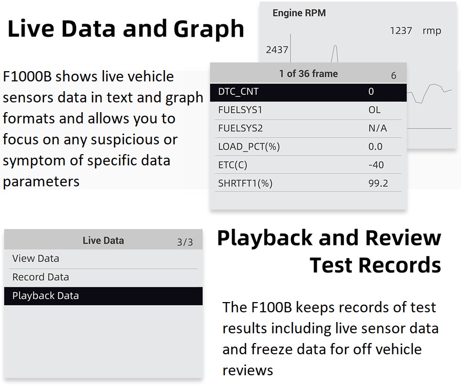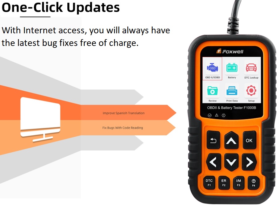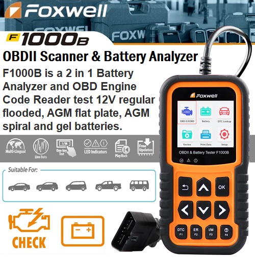 The Foxwell F1000B is a Battery Analyzer and OBD Engine Code Reader which is dedicatedly developed to test 12V regular flooded, AGM flat plate, AGM spiral and gel batteries. It provides a quick, easy and affordable solution for technicians to check battery health and more, it provides fast solution for OBD faults check.