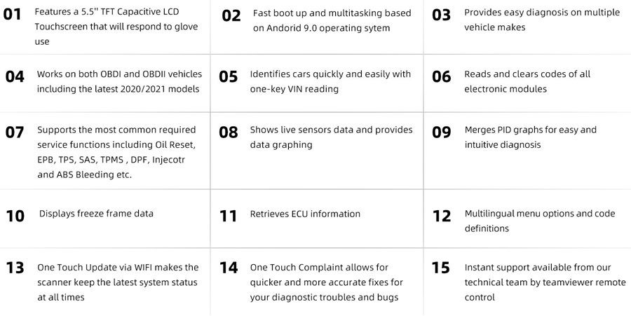 - Supports the most common required service functions including Oil Reset, EPB, TPS, SAS, TPMS, DPF, Injector and ABS Bleeding etc.