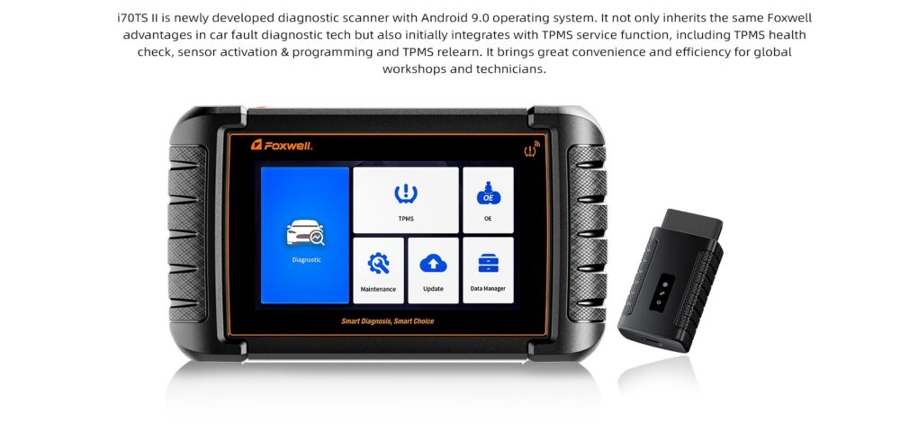 The Foxwell i70TS II is newly developed diagnostic scanner with Android 9.0 operating system. It not only inherits the same Foxwell advantages in car fault diagnostic tech but also initially integrates with TPMS service function, including TPMS health check, sensor activation & programming and TPMS relearn. It brings great convenience and efficiency for global workshops and technicians.