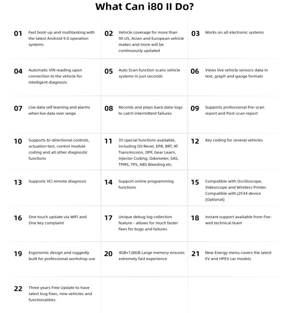 The newly released Foxwell i80 ll featuring multitasking Android 9.0 operating system, 10.1-inch LCD touchscreen, fast quad-core processor, extensive coverage and OE-level diagnosis, is built for maximum convenience and efficiency during diagnosis and service work.