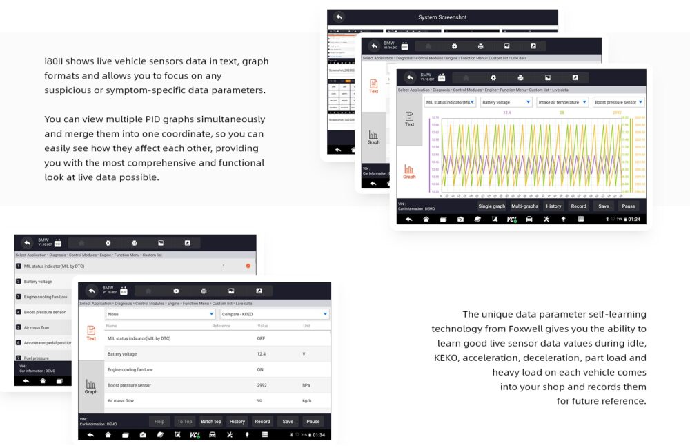 i80Il shows live vehicle sensors data in text, graph formats and allows you to focus on any suspicious or symptom-specific data parameters.