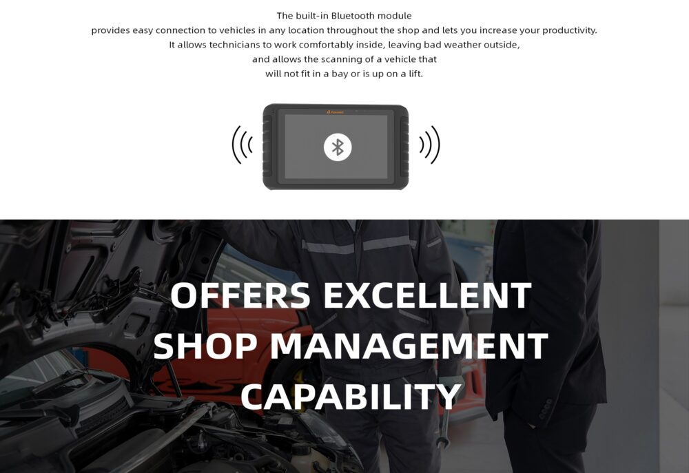 The built-in Bluetooth module provides easy connection to vehicles in any location throughout the shop and lets you increase your productivity. It allows technicians to work comfortably inside, leaving bad weather outside, and allows the scanning of a vehicle that will not fit in a bay or is up on a lift.