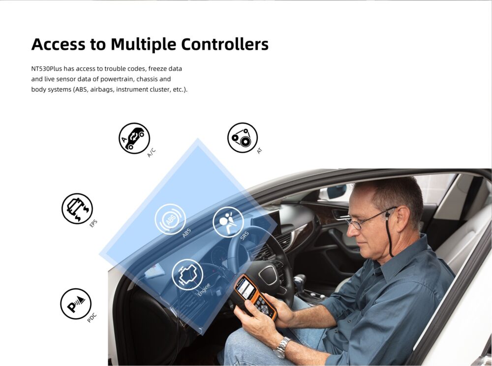 The Foxwell NT530Plus has access to trouble codes, freeze data and live sensor data of powertrain, chassis and body systems (ABS, Airbags, Instrument cluster, etc.)