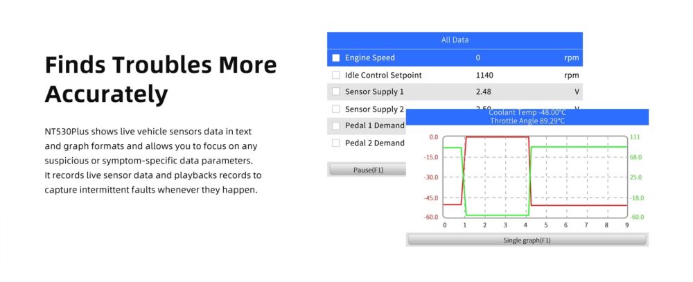 The Foxwell NT530Plus shows live vehicle sensor data in text and graph formats and allows you to focus on any suspicious or symptom-specific data parameters. It records live sensor data and playback records to capture intermittent faults whenever they happen.