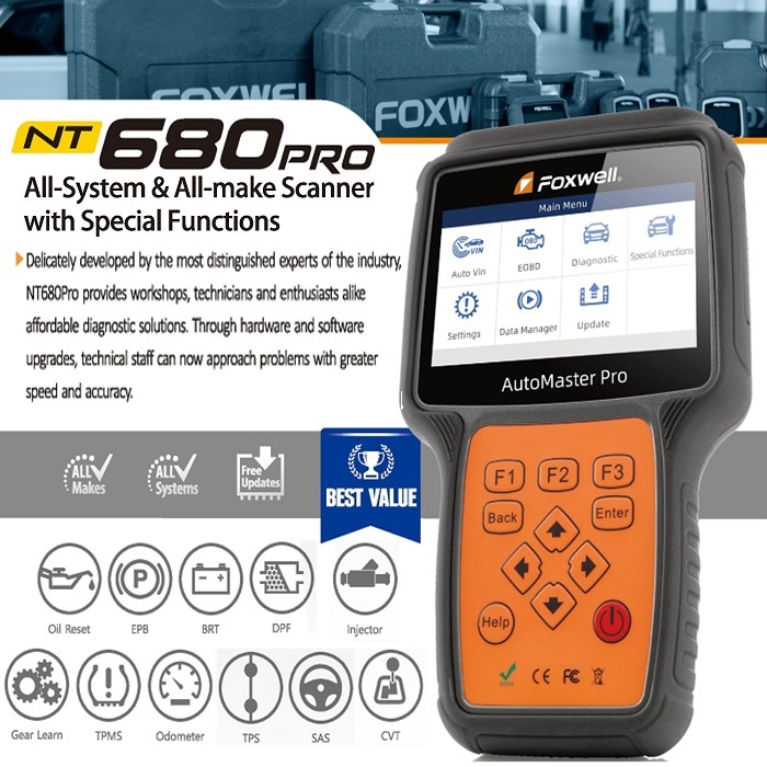 The Foxwell NT680Pro all system scanner is Delicately developed by the most distinguished experts of the industry, NT680Pro provides workshops, technicians and enthusiasts alike affordable diagnostic solutions. Through hardware and software upgrades, technical staff can now approach problems with greater speed and accuracy.