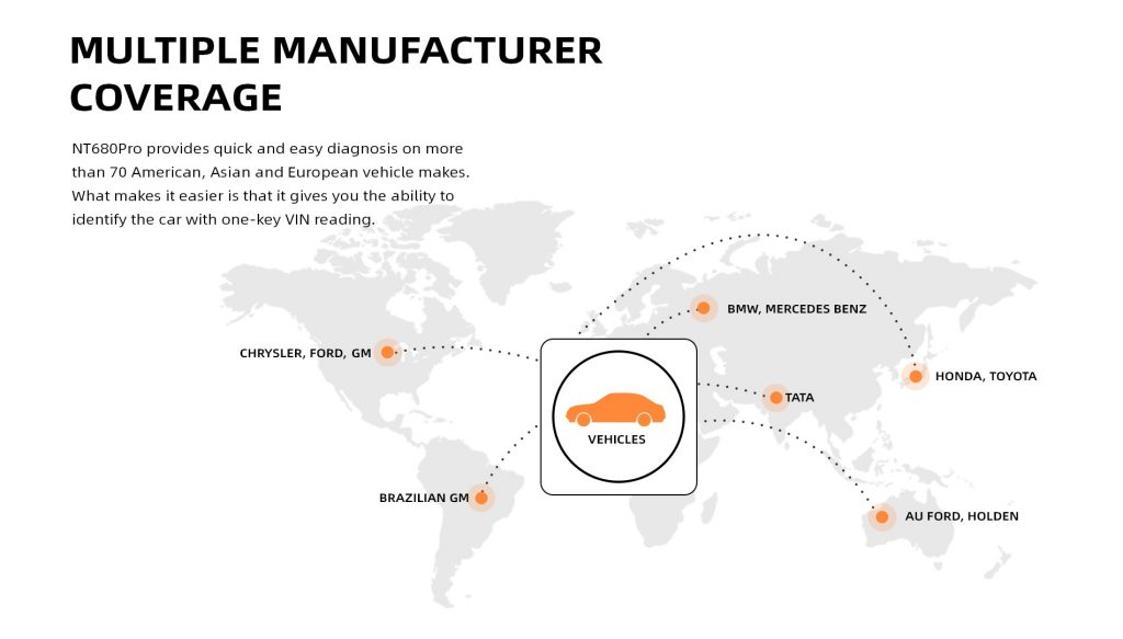 - Provides easy diagnosis on more than 70 vehicle makes.